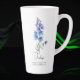 Birth month flower July Larkspur latte mug with an illustration of a larkspur flower. Below the flower, the name is written in a stylish script font. Beneath the name, it states "July - Larkspur," indicating that owner's birth month is July and her birth flower is the larkspur. It is a personalized mug, created as a thoughtful gift for someone born in July.