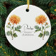 Birth month flower November Chrysanthemum ornament featuring an illustration of a Chrysanthemum flower. Below the flower, the name is written in an elegant script font. Beneath the name, it states " November - Chrysanthemum" indicating that the owner's birth month is November and her birth flower is the Chrysanthemum. It is a personalized ornament, customized as a thoughtful gift for someone born in November.