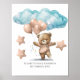 An adorable pink brown baby bear with balloons and stars with blue clouds above her. Add your daughters name and birthday. A perfect poster for the nursery.