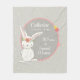 Cute birth stats fleece blanket with a little bunny and a flower pattern in the background. Beautiful personalized gift for new baby girls.