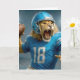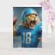 A lion wearing football gear, with a fierce expression, prepares to throw a football on the field as bright stadium lights illuminate the scene.