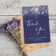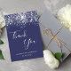 A thank you card for a 50th (or any age) birthday. A navy blue background color, decorated with faux silver glitter dust. On front hand lettered script and the text: Thank You, your text, title and a date.
