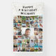 Celebrate any age birthday with a personalized photo memories banner sign in your choice of colors and font styles utilizing this easy-to-upload photo collage template with 55 square pictures of him or her through the years accented with gold confetti. The sample shows HAPPY # BIRTHDAY NAME in black text on a black background. BANNER OPTIONS: The sample is shown in the 2.5x4' indoor style--other sizes and "outdoor" are available on the ordering page as well as the option of transferring the design to a foam board, poster, tapestry or other product or have the designer convert it to a DIGITAL DOWNLOAD file for local printing PRIOR to personalizing it. ASSISTANCE: For help with design modification or personalization, color change, resizing, transferring or converting, contact the designer BEFORE ORDERING via the Zazzle Chat MESSAGE tab below or email makeitaboutyoustore@gmail.com.