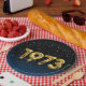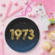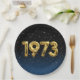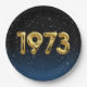 Gold mylar birthday balloons for 1973 birthday on gradient black and blue background with night stars.