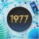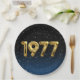 Gold foil balloons for 1977 birth year on gradient black and blue background with night stars for birthday party.
