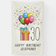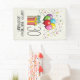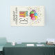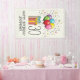 Birthday theme design featuring colorful birthday balloons and two present boxes wrapped with pretty bows. The design is framed by cheerful confetti made out of stars and dots. The color scheme includes colors such as red, pink, blue, yellow, purple, teal, and beige. There are also two personalizable text areas where one is meant for the person's age and another is meant for custom text.