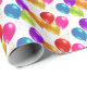 This wrapping paper is shown in a colorful birthday balloons print design.