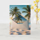 A surreal scene depicts an open envelope standing on a tropical beach, with palm trees and a beautiful sunset in the background.