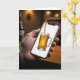 A man's hand holds a smartphone displaying an image of a beer mug, while beer is poured from a bottle into the mug.