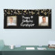 Celebrate any birthday with this festive black and gold star themed banner sign featuring two photos (perhaps Then and Now pictures), your custom text in modern brush script typography and a border of gold confetti, streamers and lights against and editable black background. PHOTO TIP: Choose photos with subjects in the middle and/or pre-crop them into square shapes BEFORE uploading and use the CHANGE tab in the PERSONALIZE section. CHANGES: Change the background color, choose a styled graphics background or change the text font style, color, size and placement by clicking on CUSTOMIZE FURTHER in the PERSONALIZE section for a custom design. Contact the designer via Zazzle Chat or makeitaboutyoustore@gmail.com if you'd like this design modified, on another product or would like coordinating items.
