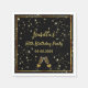 A napkin for a trendy, modern 50th birthday party. A classic dark purple background, with a faux gold frame and champagne flutes, glass and bubbles, golden colored letters. Templates for a name, age 50 and a date.