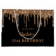 A gift bag for a girly and glamorous 21st (or any age) birthday. A classic black background with faux gold glitter drips, paint dripping look. Personalize and add a date, name and year 21. The name is written with a golden modern hand lettered style script.