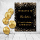 A welcome poster for a girly and glamorous 21st (or any age) birthday party. A stylish black background decorated with faux gold glitter dust. Personalize and add a name and age. Golden letters.
