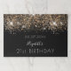 A black background with faux gold glitter dust. Personalize and add a date, name and age 21. The name is written with a modern hand letteres style script.