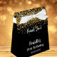 An elegant and glamorous birthday, any age. A black background with faux gold glitter, sparkles. With the text: Thank You! Personalize and add your name age and a date. White letters. The name is written with a trendy hand lettered style script.