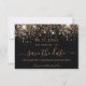 A girly and trendy Save the Date card for a birthday party. A black background decorated with faux gold glitter, sparkles. Personalize and add a date and name. Golden colored letters. The text: Save the Date is written with a large trendy hand lettered style script with swashes.