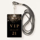 A modern, stylish and glamorous badge for a 21st (or any age) birthday party. A black background with faux gold glitter. Personalize and add a name. The name is written with a modern hand lettered style script with swashes. The text: VIP Number 21 is written in a golden color. To keep the swashes only delete the sample name, leave the spaces or emoji's in front and after the name.