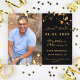On front: Add a vertical size photo. A classic black background color, decorated with faux gold stars. Personalize and add a name and details. Golden letters. For both him and her.