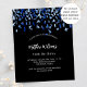 A modern, elegant and invitation. A black background decorated with blue confetti. Personalize and add a name and details. White text.