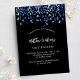 A modern, elegant and invitation. A black background decorated with blue confetti. Personalize and add a name and details. White text.