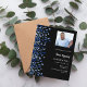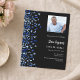 A modern, elegant and invitation. A black background decorated with blue confetti. Personalize and add photo, a name and party details. White text.