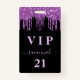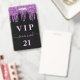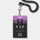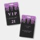 A modern, stylish and glamorous badge for a 21st (or any age) birthday party. A black background with purple faux glitter drip, paint dripping look. Personalize and add a name and age 21. The name is written with a modern hand lettered style script with swashes. The text: VIP og Number 21 is written in a light pink color. To keep the swashes only delete the sample name, leave the spaces or emoji's in front and after the name.