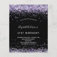 A girly and feminine 21st (or any age) birthday party invitation. On front: A chic black background. Decorated with purple, violet faux glitter dust. Personalize and add a name and party details. The name is written with a hand lettered style script.
