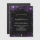A girly and feminine 21st (or any age) birthday party invitation. On front: A chic black background. Decorated with dark purple faux glitter dust. Personalize and add a name and party details. The name is written with a hand lettered style script, light purple colored letters.