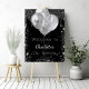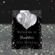 A welcome board for a girly and glamorous 21st (or any age) birthday party. A black background decorated with faux glitter drips, paint dripping look, faux silver balloons. Personalize and add a name and age.
