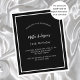 A modern, elegant and invitation. A black background decorated with white frames. Personalize and add a name and details. White text.