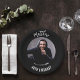 A classic black background. Personalize and add his name, age and photo. White text, curved.