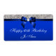 Pretty royal blue and silver any age birthday water labels with a flat graphic image of silver sequins and royal blue bow with white text.