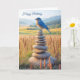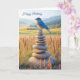 A bluebird perches gracefully atop a balanced stack of smooth stones in a sunlit field for a birthday.