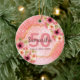 A trendy ornament for a 50th birthday, as a favor, gift or keepsake. With a faux gold hexagon geometrical shaped frame. Decorated with watercolored dahlia flowers in pink, cream and coral. Living coral with polka dots as background. Templates for a name, age 50 and a date. Date of birth or date of the party. Burgundy and coral colored letters.