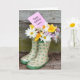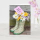 White daisy and yellow daffodil bouquet with pink envelope on rustic weathered wood for birthday.