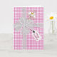 White sheer bow with white daisy and gift tag on white and pink gingham pattern.