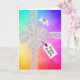 White sheer bow with white daisy and gift tag on neon rainbow gradient pattern.