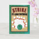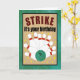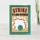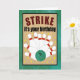 This is a birthday card for anyone who loves bowling. It has ten pins being struck with a green marble bowling ball. The text says, ‘Strike - it’s your birthday.’
