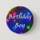 A festive colorful button pin with a background bokeh of colored party lights and the words "Birthday Boy". Easy to customize to personalize. A happy and fun button pin for children and all ages!