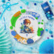 Personalized name and age birthday party plates. Cute little anime boy playing video games with a blue, orange and green paint splatter background done in an ai watercolor style illustration.