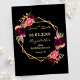 On front: Trendy bohemian boho style. Decorated with watercolored roses in burgundy and pink. Elegant black background. A faux gold geometric frame and templates for a name, date and age. Burgundy colored letters. The name and the text: Save the Date are written with a modern hand lettered style script.