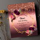 On front: An invitation for a 50th (or any age) birthday party. A burgundy gradient background with a faux gold geometric frame. Decorated with dark purple and burgundy flowers, roses and boho style feathers. Faux bronze glitter dripping. Templates for a name and party details. The name is written with a hand lettered style script, black colored letters.