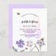 A white background on the front. Decorated with bees and painted wildflowers in violet and pink and a large butterfly. Personalize and add a name and party details.