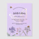 A violet, lavender colored background. Decorated with bees and painted wildflowers in violet and pink and a large butterfly. Personalize and add a name and party details.