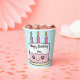 Cute birthday cake paper cup, decorated with pink and white with happy birthday, name and bluebackground. See my store for matching theme items.