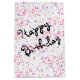 Colorful birthday candy sprinkles on white background with Happy Birthday text.