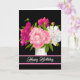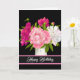 Birthday card is shown with a black background and a pretty peony bouquet.