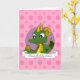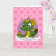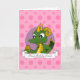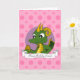 Personalized Greeting Card with illustration of head of a cute little green dragon in purple circle on seamless pink polka dot pattern, cute fantasy / fairy-tale design for kids by Maxi Harmony, with customizable text templates for child's name, your message to her or him and your signature