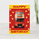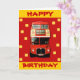 Birthday card design with the iconic Routemaster London Bus placed on a red square with small yellow squares dotted around. Bold Happy Birthday greetings on the front and inside, customizable.