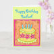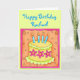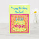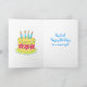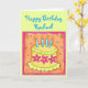 Happy Birthday card features a yellow and green birthday cake with turquoise candles on an orange background with a whimsy pink border on a lime green card. Great also for a 4th (fourth) birthday. Fully customizable for personalization and message. Celebrate a birthday or other occasion with the whimsy cake and cupcake original art that is perfect for both boys and girls as well as adults. The colors are in both softer and more vibrant colors.